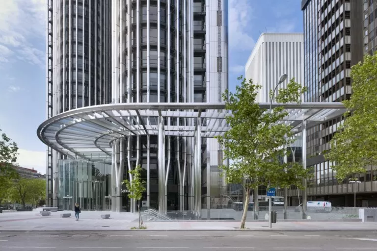 Frameless glazing suspended from the building structure. Sheer glass wall with unbeatable, versatility, individuality and variability. Matchless elegance at the entrance with suspended glass supported by glass fins, to break the restricted inside view of the complex.